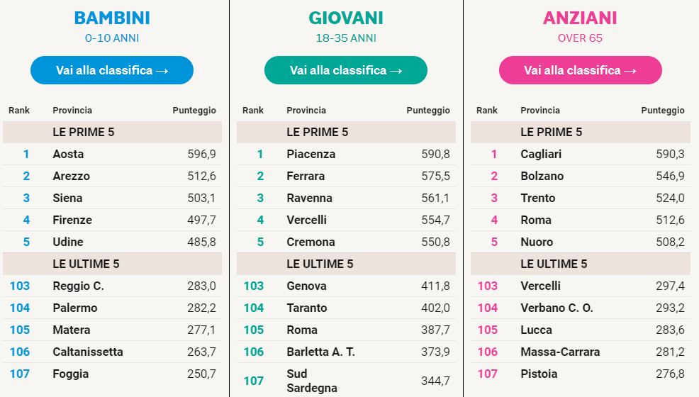 L’inchiesta del più importante quotidiano economico italiano risponde alla domanda su quali siano le migliori province in termini di qualità della vita per bambini, giovani e anziani. Ebbene, per i bambini nella fascia 0-10 anni la risposta è Aosta, col capoluogo della Valle d’Aosta premiato col primo posto. Un podio che vede la presenza anche di Arezzo e Siena, seguite da Firenze, un trio toscano. Sul lato opposto della classifica l’ultima posizione è occupata da Napoli, preceduta da Caltanissetta, Matera, Palermo e Reggio Calabria, rendendo evidente ancora una volta la presenza nel 2022 di una ‘questione meridionale’.