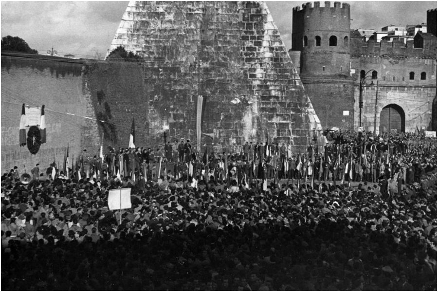 Alcune migliaia di persone tra cui Sandro Pertini, il sindacalista Bruno Buozzi, Emilio Lussu, Giuliano Vassalli, Adriano Ossicini accorsero per spalleggiare paracadutisti e granatieri a Porta San Paolo. La battaglia infuriò per due giorni intorno alla Piramide di Caio Cestio, all’imbocco di via Marmorata. Di fronte alla basilica di San Paolo era stato allestito un ospedale da campo, ma scontri e granate piovvero anche su piazza di Spagna, sulle vie del centro, sulla città, traversata dalle autoblindo degli uni e degli altri senza che neppure i militari al loro interno capissero bene cosa stava succedendo. Non era una battaglia ordinata e da manuale. “E’ come nella pellicola di Stalingrado”, commentava Guttuso dopo aver combattuto intorno alla Piramide. “Si respirava un’aria di quarantotto, di Repubblica romana, borghesi armati e animosi, operai, artisti, studenti, mischiati a soldati di gran cuore”, racconterà in seguito lo scrittore Paolo Monelli. Nelle strade all’inizio regnava l’ottimismo, i tedeschi erano descritti come in fuga o prigionieri, gli stessi soldati che, senza nessuno a guidarli, accorrevano verso l’epicentro degli scontri si mostravano sicuri. Ma Monelli, nel suo straordinario libro-reportage scritto nel 1945 Roma 1943, enumera i segnali di senso opposto. I ministeri erano vuoti, nessuno rispondeva ai telefoni, nelle caserme e a palazzo Chigi, allora sede del ministero degli Esteri, si bruciavano in tutta fretta carte e archivi.