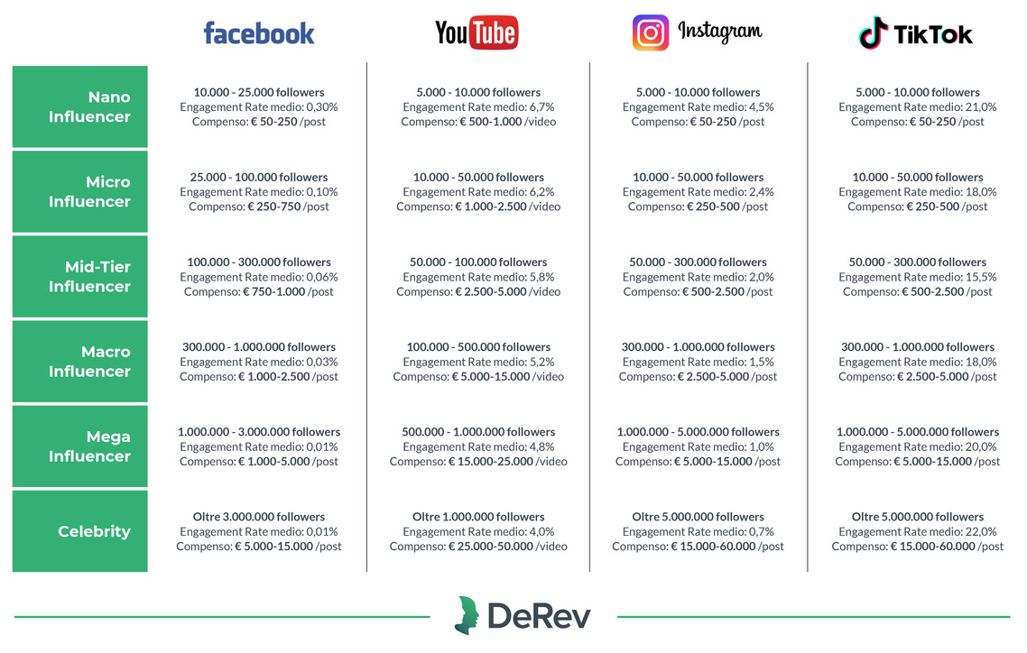 Tornando al listino, DeRev classifica gli influencer in base a tre fattori analitici: il numero di followers, l’Engagement Rate e il tasso di conversione, il tutto diviso tra le varie piattaforme. Ne emerge una fascia di compenso medio per tutte le varie categorie: Nano Influencer, Micro Influencer, Mid-Tier Influencer, Macro Influencer, Mega Influencer e Celebrity.