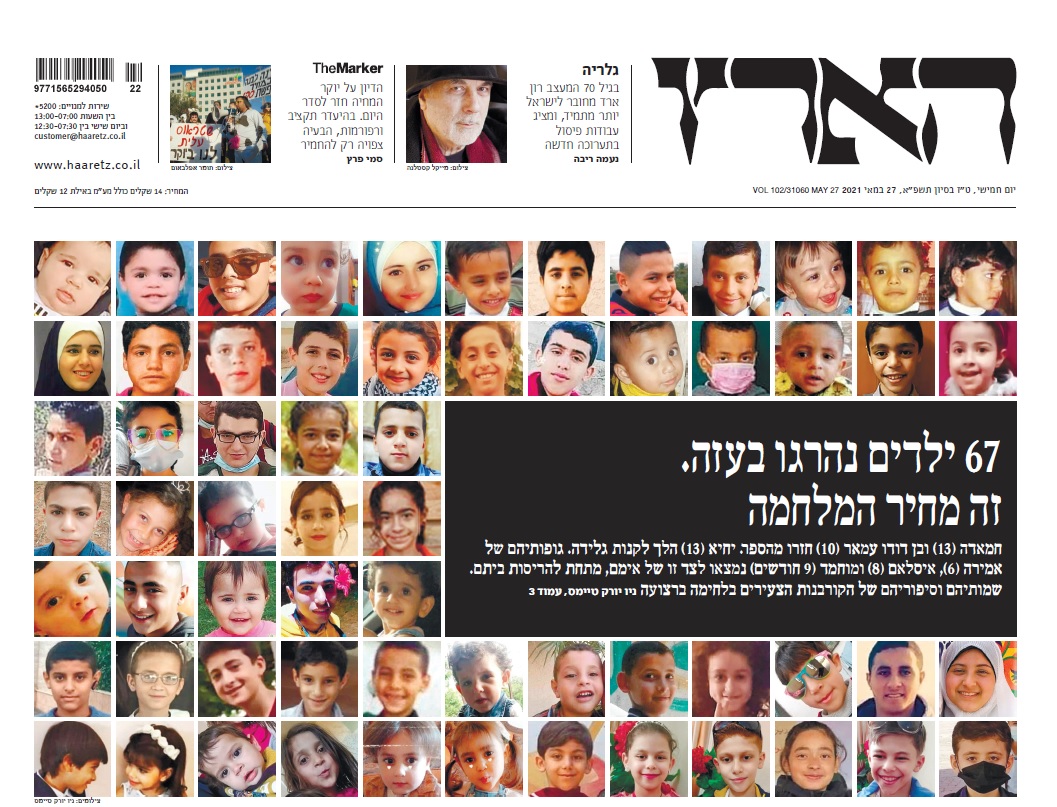 Questa mattina Haaretz, il più noto giornale progressista di Israele, pubblica in prima pagina i volti dei 67 bambini morti durante gli 11 giorni di guerra nella Striscia di Gaza, vittime dei raid israeliani prima che si arrivasse una settimana fa ad una tregua.