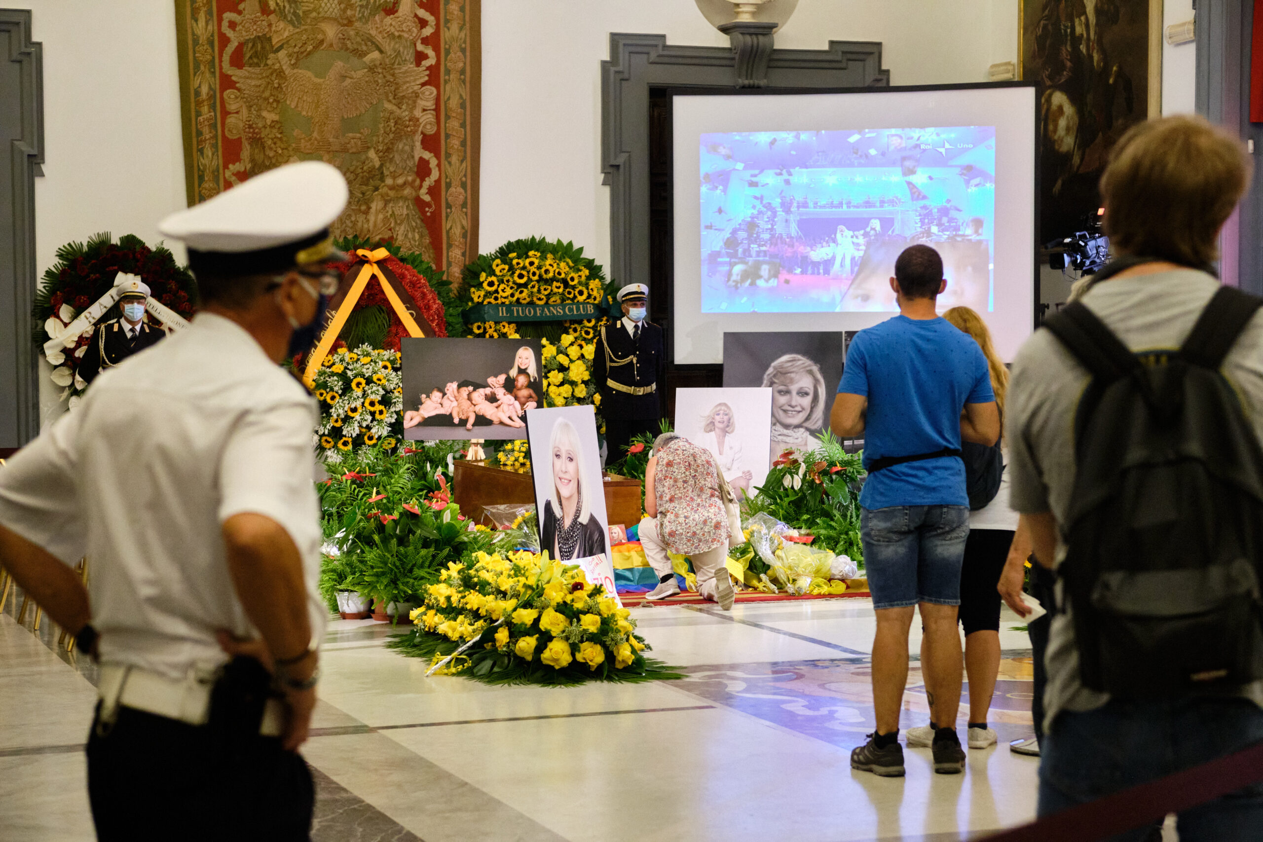 La camera ardente in Sala della Protomoteca in Campidoglio resterà aperta domani dalle 8 alle 11. Nella giornata di oggi tanta la gente in fila per dare l’ultimo saluto alla cantante e presentatrice. A contornare il feretro di Raffaella Carrà, due cuscini di fiori gialli, il suo colore preferito, che torna nella corona in fondo, inviata dal suo fan club ufficiale e posta accanto a quelle della Rai e della sindaca Virginia Raggi, che ha accolto il corteo funebre.