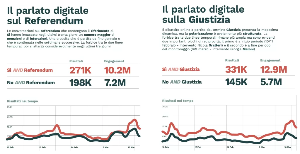 A scanso di equivoci è necessario fare una precisazione di metodo: i dati che vengono raccolti da qualsiasi monitoraggio di conversazioni digitali, post social o articoli, non sono e non possono essere considerati alla stregua di un sondaggio. Il listening, per quanto ricco di informazioni, non ci dirà mai per chi o cosa voteranno gli italiani, anche se si parla di referendum o di giustizia. Quindi, con buona pace dei vincoli normativi che vietano la diffusione pubblica di sondaggi a ridosso delle elezioni, qui abbiamo a che fare con altro: ci troviamo in una cava a cielo aperto dalla quale estrarre alcune vagonate di dati da commentare con un minimo di buonsenso.
