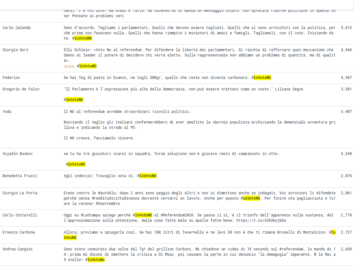 Guardando la topten dei tweets più graditi dal pubblico notiamo come il No prevalga su tutta la lista. Carlo Cottarelli, Carlo Calenda e Giorgio Gori sono stati i più graditi. Chi ha sbancato per la sana ironia invece è stato l’utente @federicovizo87 che rimarraànella storia per aver scritto: Se hai 1kg di pasta in bianco, ne togli 500gr, quello che resta non diventa carbonara. #iovotono