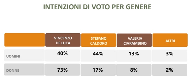 Entrando nel dettaglio dei voti ai candidati, De Luca svetta col suo 58,6%, trenta punti sopra il 28,9% di Caldoro e solo il 9,9% stimato per l’esponente del Movimento 5 Stelle Valeria Ciarambino. Un risultato che, come sottolinea il Sole, “sarebbe un ottimo risultato” per De Luca “anche se in calo di sei punti rispetto al precedente sondaggio Winpoll”.