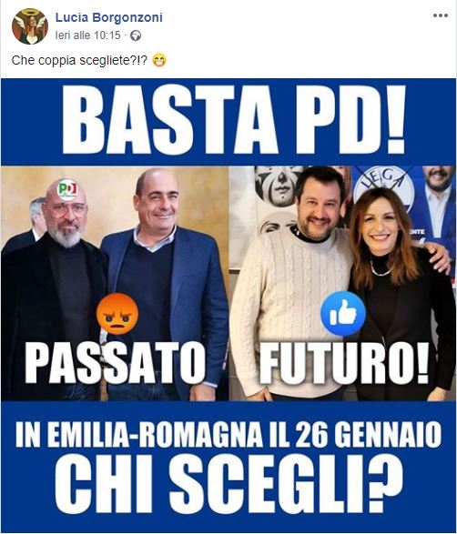 IL SONDAGGIO LEGHISTA – La senatrice, che sfiderà domenica 26 gennaio il governatore uscente del Pd Stefano Bonaccini, aveva pubblicato mercoledì mattina un sondaggio rivolto alla sua base elettorale: “: “Che coppia scegliete?” era la domanda, corredata dalle foto di coppia di Zingaretti-Bonaccini e Borgonzoni-Salvini. Per votare il metodo era semplice: un like significava destra, una faccina arrabbiata significava sinistra.