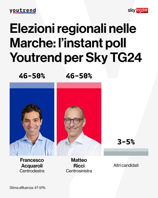 Nel primo instant poll ufficializzato subito dopo la chiusura dei seggi, il candidato del centrodestra Acquaroli si attesterebbe intorno ad una forbice compresa tra 48,5-52,5%. Distaccato di poco Ricci: 45,5- 49,5%.