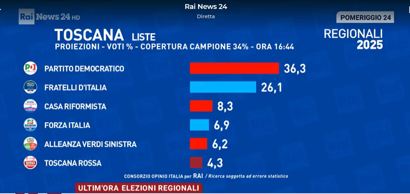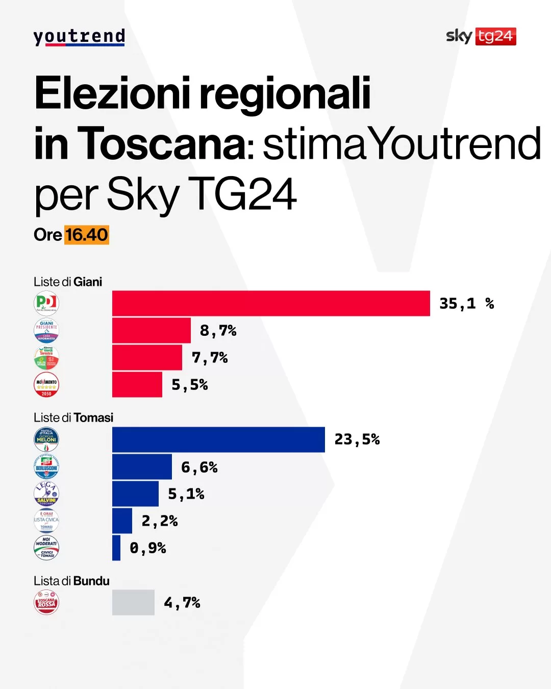 Secondo l’instant poll Youtrend per SkyTg24 relativo ai partiti, il Pd 35-39% è primo, segue Fdi 18,5-22,5%, Avs 7,5-9,5%, Lista Giani-Casa Riformista 7,5-9,5% e Forza Italia 6-8% dei voti secondo l’instant poll Youtrend per Sky Tg24. Male la Lega di Salvini e Vannacci (che vive a Viareggio) tra il 4,5 e il 6,5%, così come il Movimento 5 Stelle.