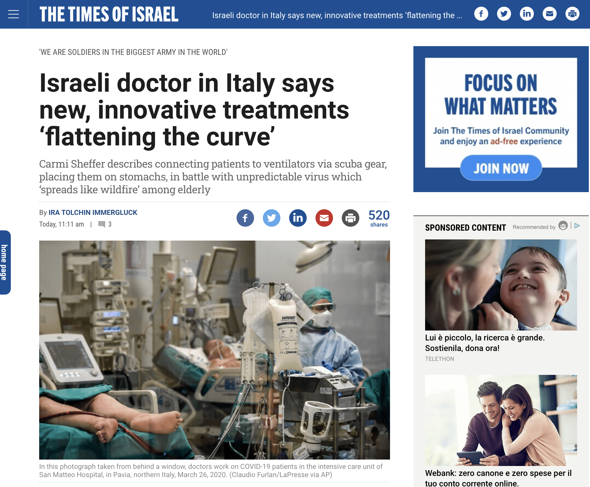 A parlare è Carmi Sheffer, medico israeliano dell’ospedale universitario di Padova. In un’intervista al Times of Israel, il ricercatore racconta come l’Italia abbia affrontato l’epidemia di Coronavirus e come la cura testata per la prima volta a Napoli dal dottor Paolo Antonio Ascierto, con l’utilizzo del farmaco anti reumatoide, il tocilizumab, abbia iniziato a dare i suoi frutti.