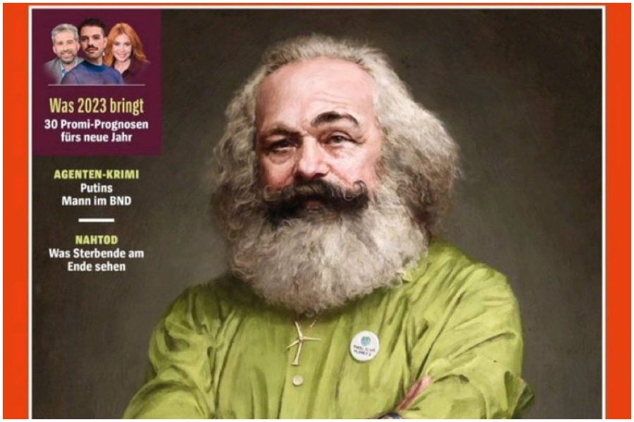 Il settimanale liberale Der Spiegel sbatte Marx in prima pagina. La copertina del primo numero del 2023 lo ritrae, sornione, con le braccia ricoperte da tatuaggi, interrogato come dispensatore di lumi attorno alle tante crisi del presente (Polykrise): energetica, commerciale, democratica (per l’insorgenza di populismo e autocrazia) e bellica (per la guerra mondiale incombente).