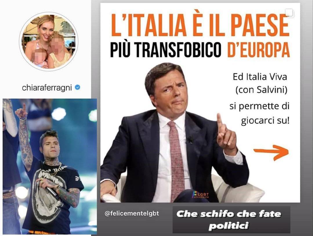 Quel voltafaccia, quell’antipatico, quel machiavellico opportunista di Matteo Renzi e di tutta Italia Viva. Chiara Ferragni, e il marito Fedez, per brevità detti Ferragnez, si sono indignati per l’inversione a U di Iv sul ddl Zan. “Che schifo che fare politici”, ha scritto l’influencer condividendo una stories della pagina felicementelgbt che recitava: “L’Italia è il Paese più transfobico d’Europa ed Italia Viva (con Salvini) si permette di giocarci su!”. È scoppiato un caso, soprattutto sui social network, riguardo al disegno di legge che sta agitando e dividendo la politica negli ultimi mesi. Renzi ha risposto, ha proposto un dibattio. Fedez è intervenuto e ha rispolverato lo “stai sereno” di renziana matrice e memoria, ai danni dell’allora premier e attuale segretario del Partito Democratico Enrico Letta.