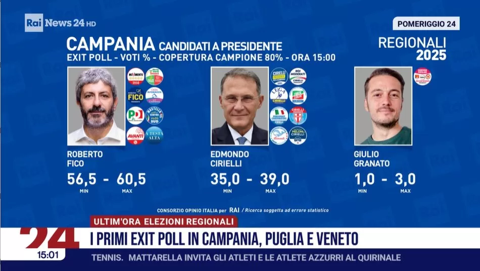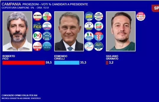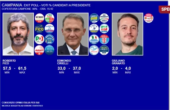 Secondo gli exit poll del ‘Consorzio Opinio Italia per Rai’, con una copertura del campione dell’80%, alle elezioni regionali in Campania il candidato del campo largo Roberto Fico è al 56,5-60,5% mentre il candidato del centrodestra Edmondo Cirielli è al 35-39%.