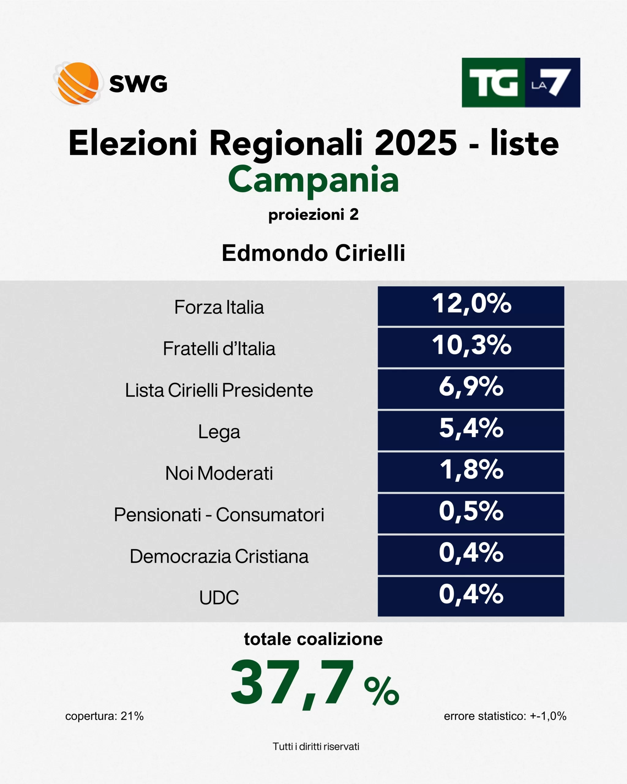 Proiezione liste centrodestra: Forza Italia 12%, Fdi 10,3%, Lista Cirielli presidente 6,9%, Lega 5,4%, Noi Moderati 1,8%, Pensionati-Consumatori 0,5%, Democrazia Cristiana 0,4%, Udc 0,4%.
