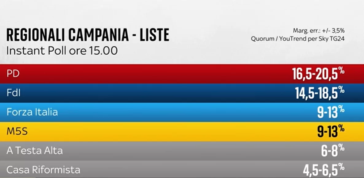 Instant Poll Liste in Campania: Pd primo partito (16.5-20.5), segue Fratelli d’Italia (14,5-18,5%). Poi Forza Italia e Movimento 5 Stelle (9-13%). A Testa Alta di Vincenzo De Luca (6-8%). Segue Casa Riformista (4.5-6.5%).