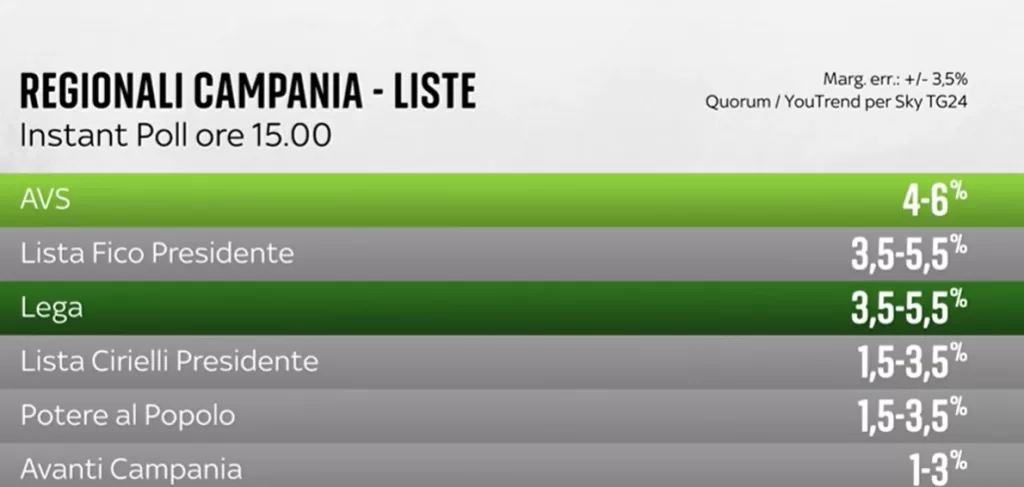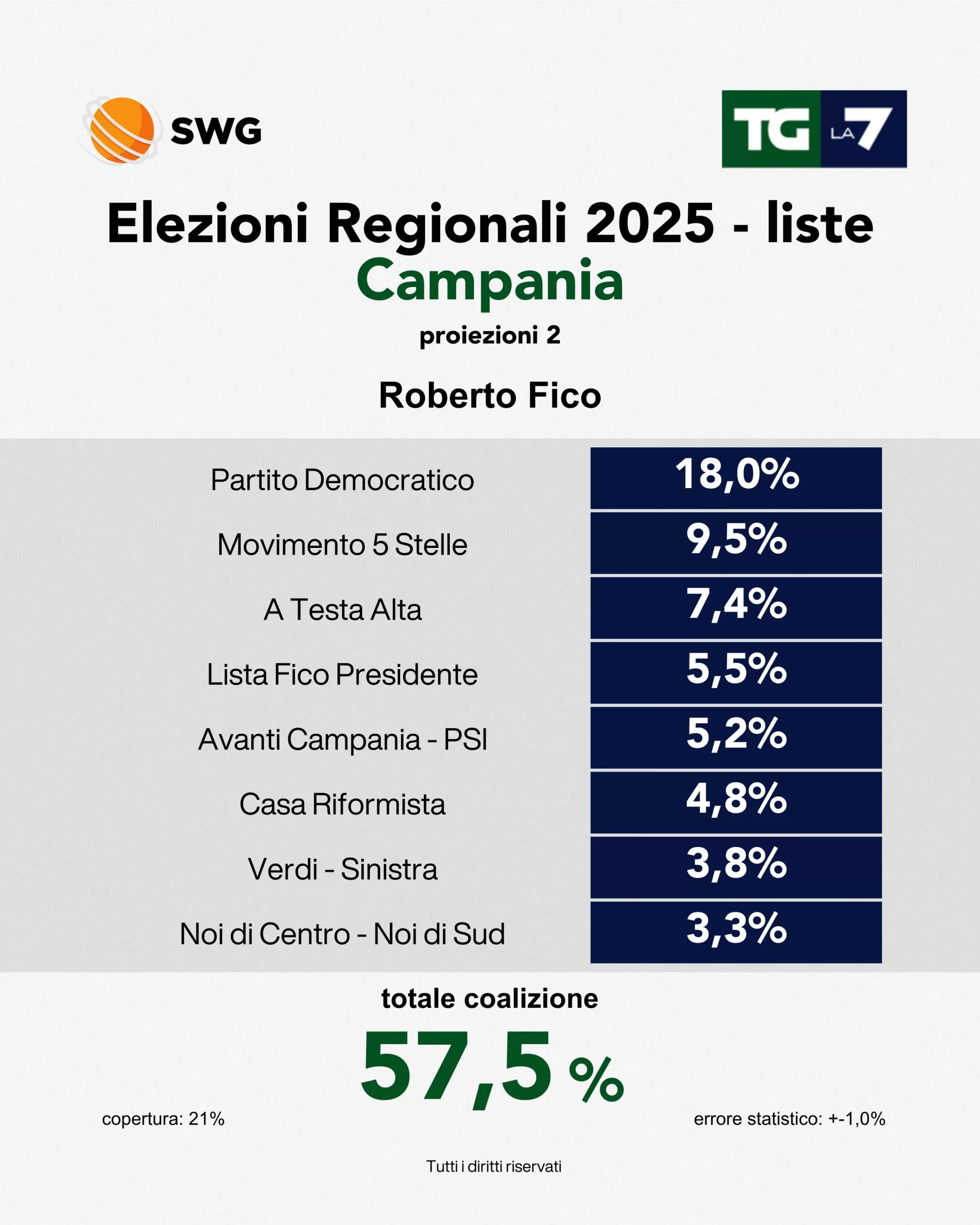 Questa la proiezione per il campo largo: Pd 18%, M5S 9.5%, A testa alta (lista De Luca) 7,4%, Lista Fico Presidente 5,5%, Avanti Campania – Psi 5,2%, Casa Riformista 4,8%, Verdi-Sinistra 3,8%, Noi di centro-Noi di sud 3,3%.