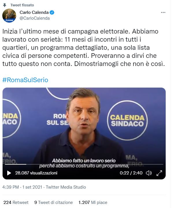 Il candidato sindaco di Roma Carlo Calenda mercoledì ha pubblicato, come fa di solito su Twitter, un video dove presenta tutto il lavoro svolto in campagna elettorale da lui e la sua squadra: “Inizia l’ultimo mese di campagna elettorale. Abbiamo lavorato con serietà: 11 mesi di incontri in tutti i quartieri, un programma dettagliato, una sola lista civica di persone competenti. Proveranno a dirvi che tutto questo non conta. Dimostriamogli che non è così”, ed alla fine lo slogan con hashtag ‘Roma sul serio’.