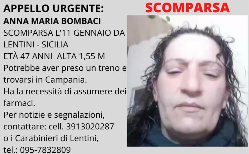 E’ stata ritrovata Annamaria Bombaci, scomparsa da Lentini (Sicracusa) lo scorso 11 gennaio. Un caso che era stato raccontato anche dalla celebre trasmissione di Rai3 Chi l’ha visto. La donna è stata riconosciuta a Napoli, in via Nuova Poggioreale. La donna era scomparsa senza lasciare sue notizie alla famiglia. Era stato ipotizzato più volte che la donna fosse diretta nel capoluogo campano.