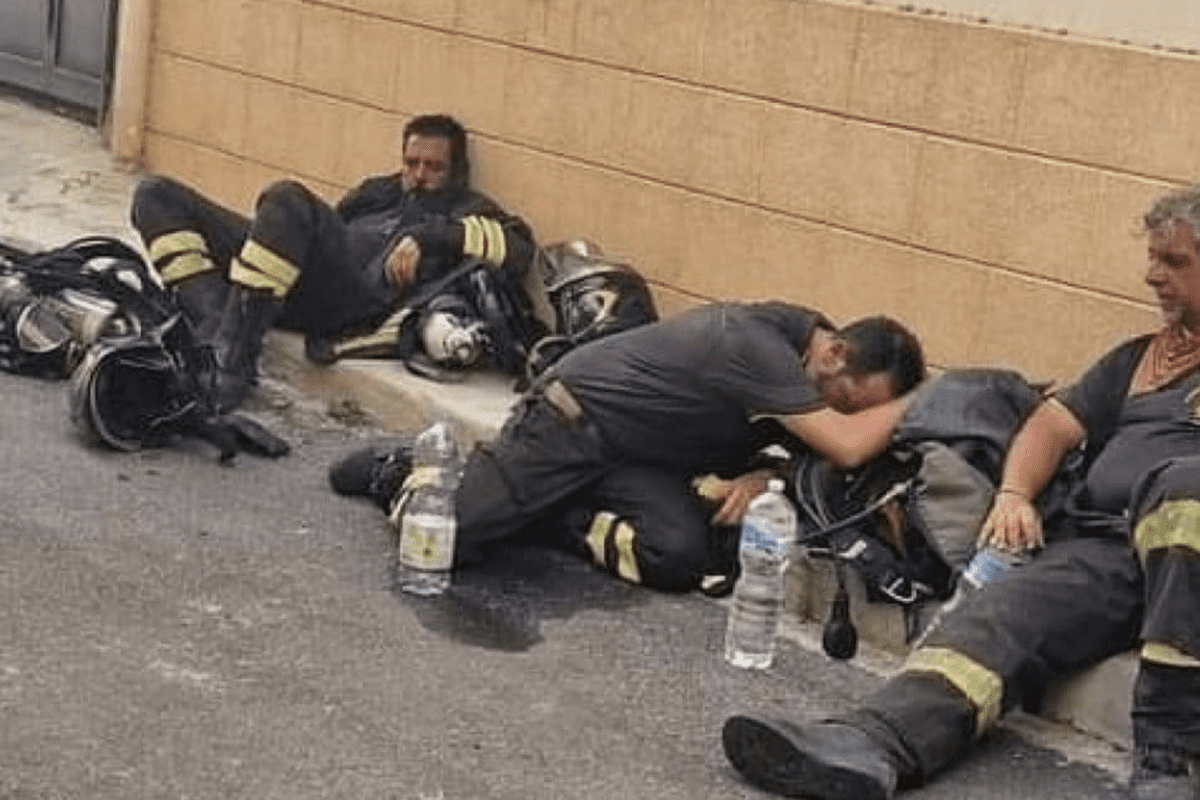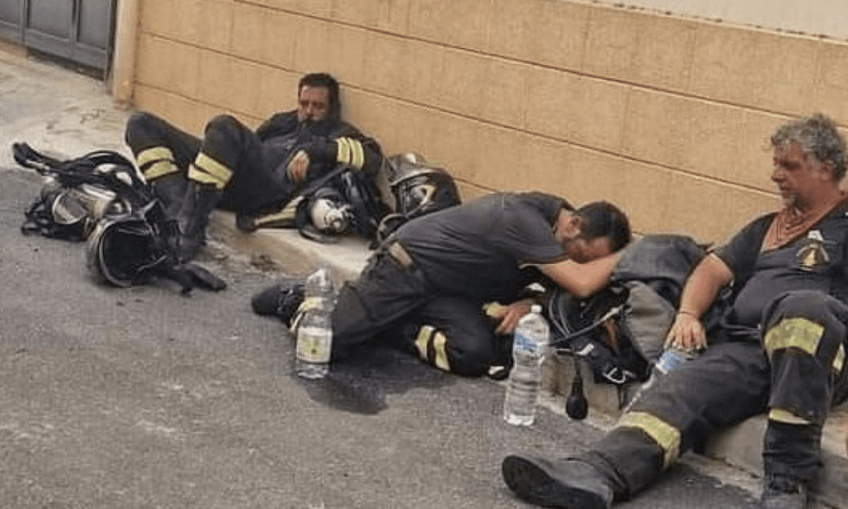 Nel frattempo sui social sta spopolando una foto che ritrae un gruppo di pompieri accasciati su un marciapiede, letteralmente stremati per il carico eccessivo di lavoro e il sacrificio profuso in questi giorni per far fronte all’emergenza incendi. A terra, dopo sforzi massacranti. Dalle loro posture e dai loro volti emerge tutto la stanchezza. L’immagine, scattata a Lentini, è emblematica: è la rappresentazione perfetta delle conseguenze fisiche vissute da chi è in prima linea per salvare il prossimo e il territorio mentre la Sicilia è divorata dal fuoco. La foto è diventata il simbolo della lotta agli incendi in Sicilia. Ma anche a quelli che in generale hanno interessato il Sud. Eroi stremati, eroi del nostro tempo. Una semplice “grazie” può sembrare scontato, ma è il più sincero e naturale omaggio che si può rivolgere ai coraggiosi uomini in divisa che vanno oltre ogni difficoltà mettendo a repentaglio la propria vita per mettere al sicuro quella altrui.