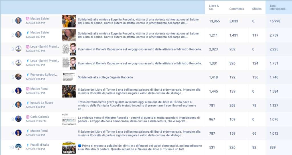Mentre su Facebook e Instagram , la Top10 degli account e delle pagine dei politici, che hanno scelto di intervenire sulla vicenda e che hanno incassato una quota consistente di interazioni, è guidata da Matteo Salvini