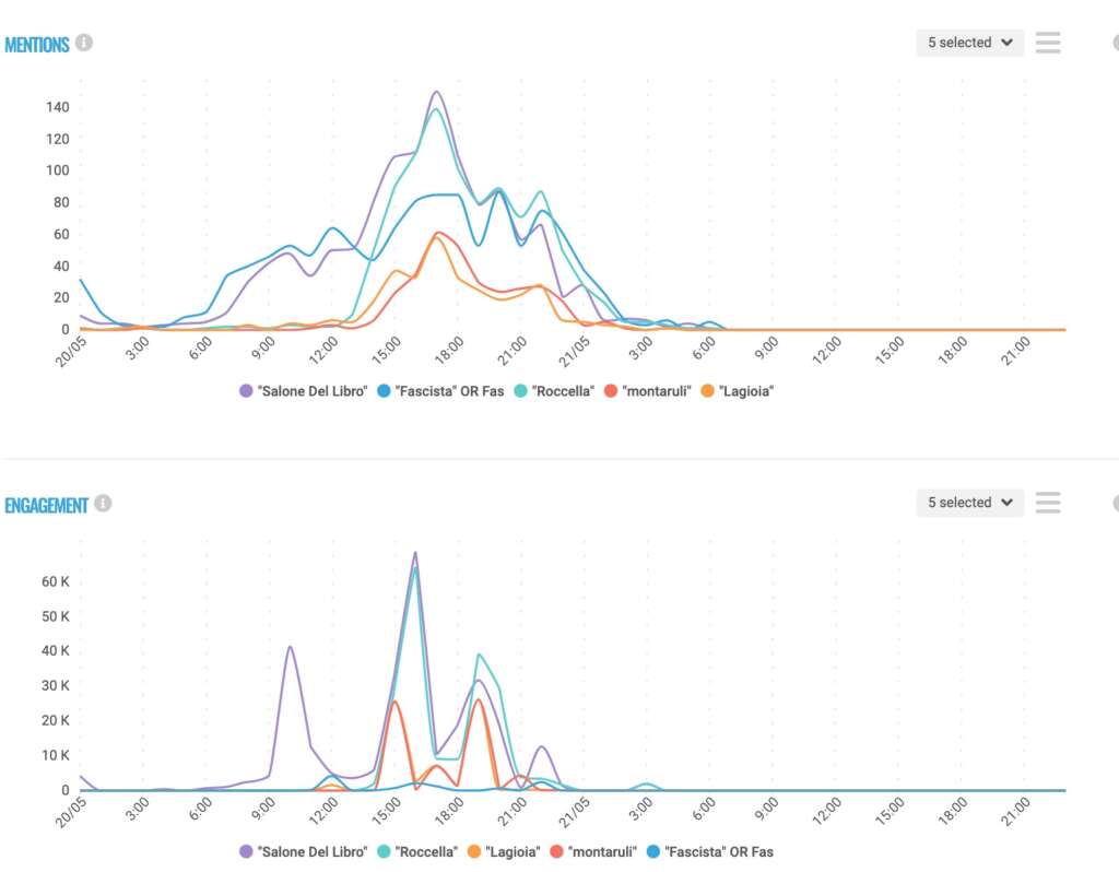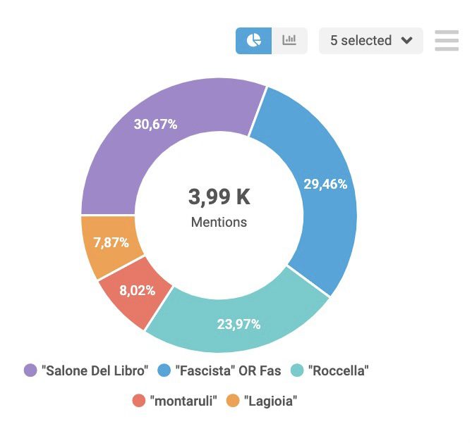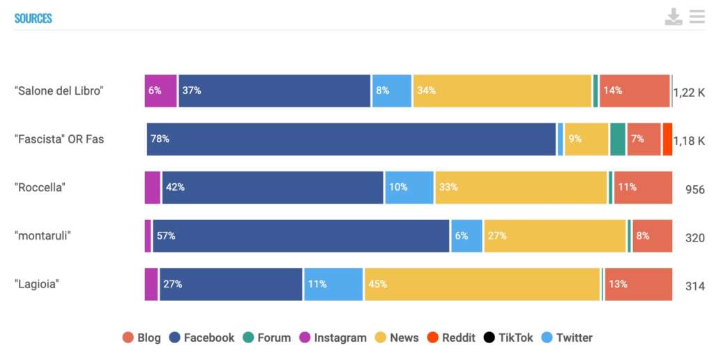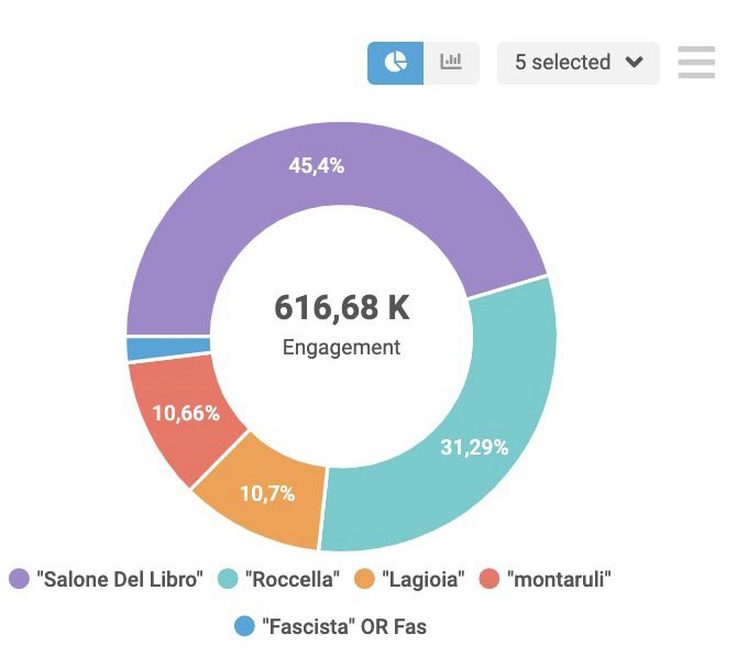 Le due keyword Roccella e Lagioia si prendono su Twitter la quota più ampia di parlato tra tutte le chiavi di ricerca. Mentre Salone del Libro incassa un 6% su Instagram e Fascista or Fascismo dilaga su Facebook.