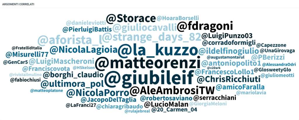Il dibattito su Twitter ha coinvolto, come plasticamente evidenziato dalla tagcloud degli account , un nucleo di opinion maker composto per lo più da attori e giornalisti interessati al dibattito politico in via esclusiva.