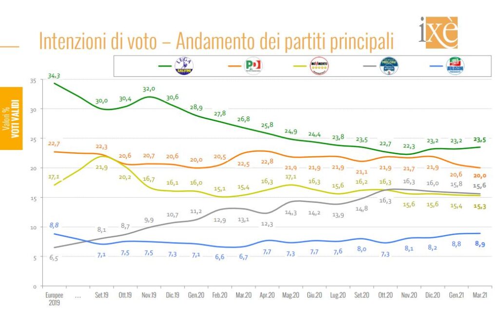 I dati dell’istituto Ixè consentono anche di comparare lo stato attuale dei partiti con le elezioni europee del 25 maggio 2019. Il grafico mostra una certa costanza a partire da quella data per il Pd e per Forza Italia, mentre si evidenziano in particolare la netta discesa della Lega, passata dal 34,3% di allora agli attuali 23,5%, e la risalita di Fratelli d’Italia, che partiva dietro Fi col 6,5% e adesso ha scavalcato sia gli azzurri che i grillini, che pure hanno perso circa 2 punti percentuali.