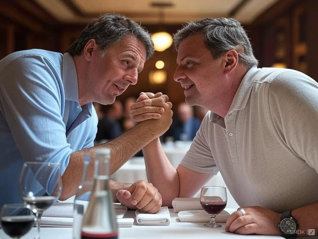 In ultimo, ma non per ultimo, ho chiesto a Grok di generarmi forse l’immagine più complicata di tutte quelle finora realizzate: “disegnarmi Matteo Renzi e Carlo Calenda che si sfidano a braccio di ferro”. Adesso, sarà per una combinazione non voluta o per una scelta consapevole, ma è curioso quanto interessante vedere che nell’immagine prodotta si vede il gomito del senatore Renzi che non poggia perfettamente sul tavolo, un escamotage che nella realtà gli avrebbe portato un vantaggio determinante per vincere la resistenza dello sfidante.