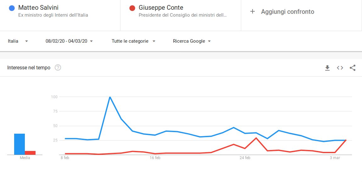Anche i dati Google confermano la tendenza di un Salvini sovrastante sul Presidente del Consiglio, ma in netto calo rispetto a Conte nella fase finale dove la comunicazione istituzionale ha iniziato a prendere il sopravvento.