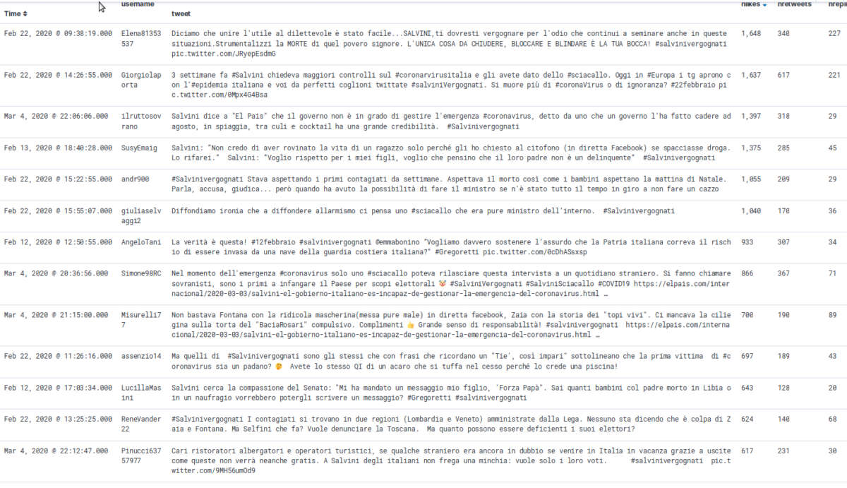 Per far fronte allo strapotere social anche in questo caso drammatico da parte del leader della Lega, gli utenti del socialnetwork del cinguettio si sono organizzati lanciando due hashtags di contestazione in due momenti diversi e precisamente #salvinivergognati e #salvinisciacallo, ai quali si sono accompagnate altre parole chiavecome #sciacallo #salvinichiediscusa #salvinivirus #salvinichiacchierone. Comune denominatore sono stati alcuni degli hashtags portanti del Corona Virus che abbiamo precedentemente affrontato ed il movimento spontaneo di #facciamorete da sempre attivo contro Salvini sul social Twitter.
