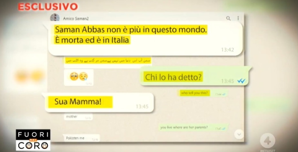 La madre di Saman Abbas avrebbe confessato il delitto ai parenti in Pakistan e avrebbe anche rivelato che a uccidere la figlia sarebbe stato lo zio, Danish Hashnain, del quale si sono perse le tracce. È quanto emerge dalla trasmissione di Rete4 Fuori dal coro durante la quale sono stati mostrati i messaggi tra la giornalista Carmen La Gatta e il miglior amico della 18enne pakistana scomparsa nel nulla a Novellara, provincia di Reggio Emilia, nella notte tra il 30 aprile e il primo maggio. Le ricerche per trovare il corpo sono state fermate.