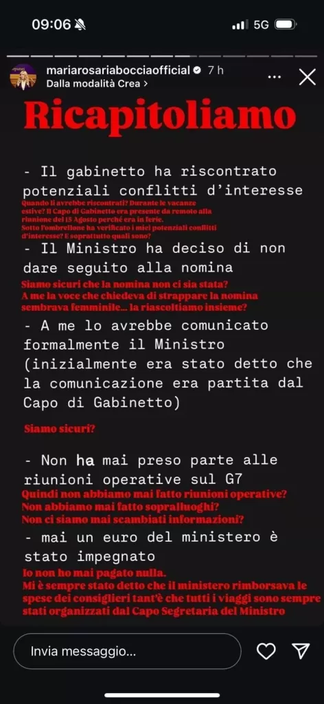 Una posizione quella di Boccia che Sangiuliano ha provato a chiarire nelle ultime ore creando, tuttavia, non pochi imbarazzi (e figuracce) alla premier Meloni. Quest’ultima ospite da Paolo Del Debbio a 4 di sera, aveva messo quasi le mani sul fuoco sulla versione del ministro. “Mi ha garantito che questa persona non ha avuto accesso a nessun documento riservato del G7 e che neanche un euro degli italiani è stato speso per lei”. Passano pochi minuti è la “persona” chiamata in causa si scatena intervenendo prima in una trasmissione di La7 e pubblicando poi diverse storie su Instagram (con il suo profilo che ha avuto un boom di follower) che, tra la sera del 2 e la mattina del 3 settembre, smentiscono il ministro Sangiuliano.