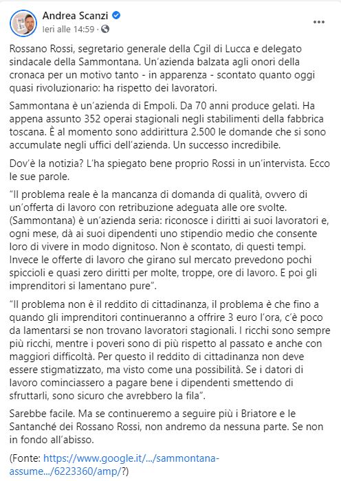 Una questione strumentalizzata da imprenditori e industriali e ‘topic’ già noto da anni, ma che ai tempi del Rdc trova ulteriore fronte di polemica. Ebbene, alla Sammontana non funziona in questo modo: per 350 assunzioni come lavoratore stagionale c’è stato il pienone, tanto da accumulare 2500 domande, come annunciava al Tirreno Rossano Rossi, segretario della Cgil di Lucca, che rivendicava come “se la retribuzione è giusta, i lavoratori ci sono”.
