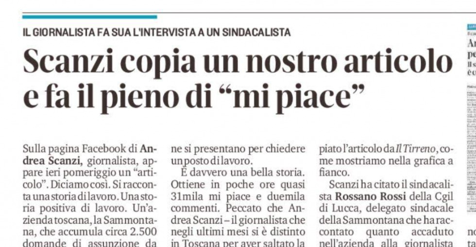In un post di ‘commento’ alla notizia, martedì pomeriggio Scanzi citava proprio l’intervista di Rossi al Tirreno, riportando le sue parole virgolettate al quotidiano. Peccato però che Scanzi non abbia mai citato il giornale o i colleghi che la notizia erano andati a cercarla.
