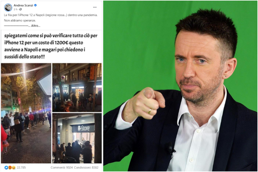 Questi napoletani: sempre i soliti. In Campania, da domenica scorsa, è in vigore la Zona Rossa. E loro in fila, in interminabili e lunghe code e attese e assembramenti. E per cosa? Per l’iPhone 12. L’ultima uscita Apple che arriva dopo pochi giorni dalla corsa alle scarpe della Lidl. Che scandalo, che schifo, che vergogna. Ci sono anche le foto: su Twitter, su Facebook. Pure sul profilo di Andrea Scanzi, il giornalista del Fatto Quotidiano. E su quello di Gianluigi Nuzzi, giornalista e autore televisivo. Uno scuorno, insomma. Peccato si tratti di una fake news.