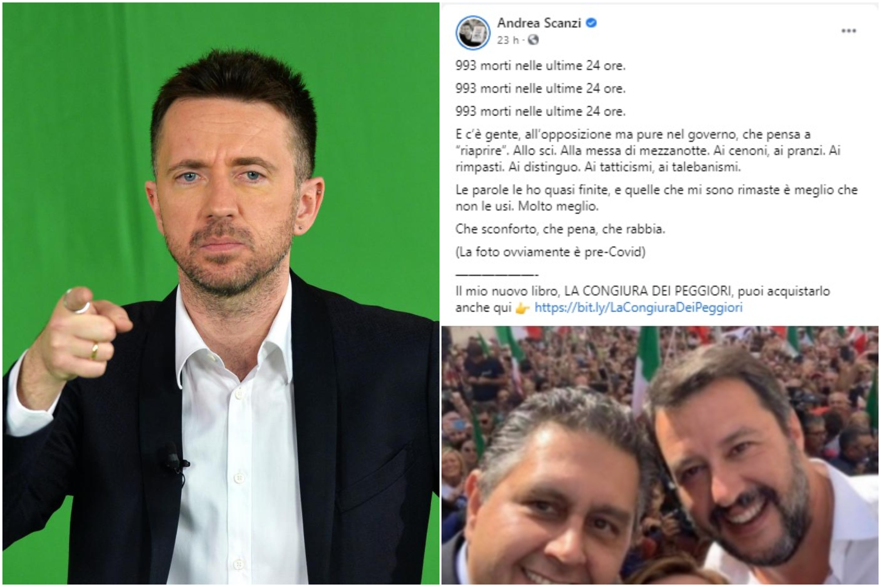 Attacca Salvini, il centrodestra e parte del Governo ma sotto al post in cui ricorda le 993 vittime del 3 dicembre, dato più alto di sempre da quando c’è l’emergenza coronavirus, Andrea Scanzi piazza il link per l’acquisto del suo ultimo libro.