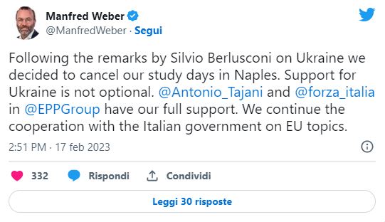 “A seguito delle osservazioni di Silvio Berlusconi sull’Ucraina abbiamo deciso di annullare le nostre giornate di studio a Napoli. Il supporto per l’Ucraina non è facoltativo”. Così il capogruppo dei Popolari Europei Manfred Weber via Twitter. “Antonio Tajani e Forza Italia hanno il nostro sostegno e proseguiamo la collaborazione con il governo italiano sui temi dell’Ue”, aggiunge Weber