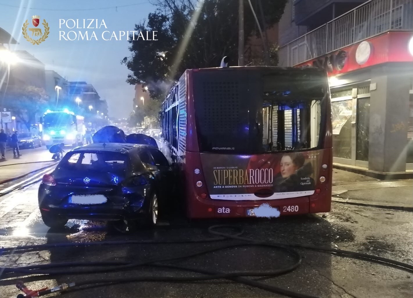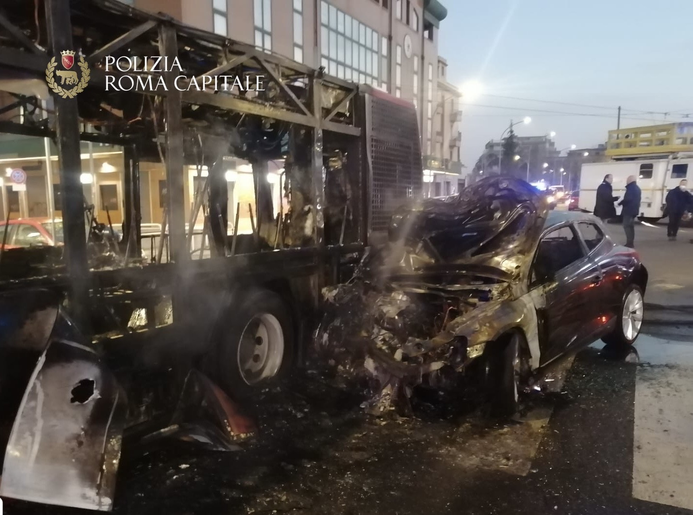 La vittima al momento non è stata ancora identificata. Indagini in corso da parte della Polizia Locale per ricostruire quanto accaduto. Sul posto giunte diverse pattuglie del V Gruppo Casilino. Gli agenti hanno immediatamente messo in sicurezza la zona, avviando i primi accertamenti. Domato l’incendio, si rilevava la presenza di un corpo carbonizzato all’interno dell’auto, mentre è stato medicato sul posto il conducente del bus. Non risultano altri feriti.