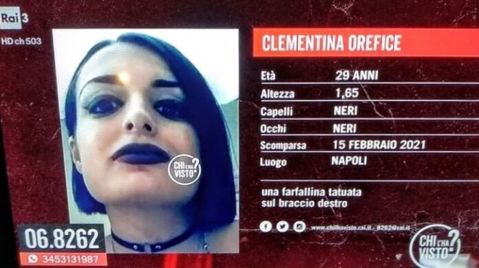 La famiglia ha presentato denuncia formale di scomparsa al commissariato di Polizia di Ischia. Clementina Orefice è nota a tutti come Martina. Dal 15 febbraio è dunque scomparsa nel nulla. La scheda mandata in onda al programma ha riportato età, 29 anni, altezza, un metro e 65, occhi neri e capelli neri. Segni particolari: un tatuaggio sul braccio destro, una piccola farfalla. Il numero della trasmissione, per fare eventuali segnalazioni sul caso, è 068262 e 3453131987.