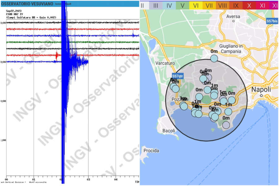 Nella zona dei Campi Flegrei è in corso uno sciame sismico da mesi. Eventi ritenuti sotto controllo dall’Osservatorio Vesuviano che più volta ha provato a rassicurare cittadini sempre più spaventati. Le ultime forti scosse hanno visto, infatti, molti residenti scendere in strada per lo spavento.