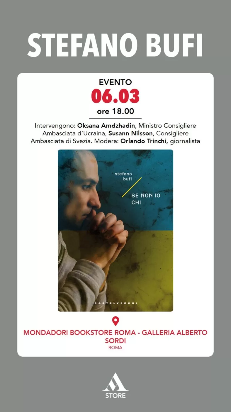 Oggi, venerdì 6 marzo alle ore 18 si terrà presso gli spazi della libreria Mondadori della Galleria Alberto Sordi di Roma, la presentazione del volume “Se non io chi” (Castelvecchi) di Stefano Bufi. Presente l’autore, parteciperanno il Consigliere dell’Ambasciata di Svezia Susann Nilsson e il Ministro Consigliere dell’ambasciata d’Ucraina Oksana Amdzhadin. Modera il giornalista Trinchi Orlando.