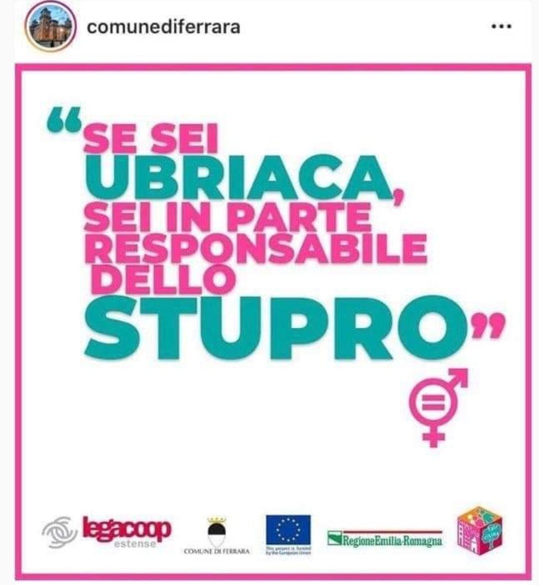 Il caso è scoppiato con le critiche pesantissime comparse sotto il post pubblicato dall’amministrazione su Instagram, parte della campagna promossa assieme a Legacoop Estense e Regione. Nella parte principale dell’immagine, poi cancellata, si legge: “Se sei ubriaca, sei in parte responsabile dello stupro”.