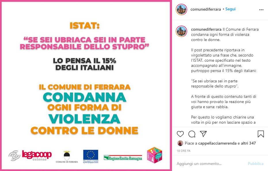Nella pubblicazione infatti manca una seconda parte, fondamentale, che ha dato il via alle polemiche: quella in cui si fa riferimento al 15% degli italiani che, secondo l’Istat, è d’accordo con una simile affermazione e che il Comune di Ferrara condanna, così come “ogni forma di violenza contro le donne”.