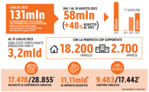 Se possibile ancora più sostenuta è la ripartenza per la ricostruzione privata. Nei primi sette mesi del 2023 abbiamo erogato 800 milioni: 131 milioni nel solo mese di luglio 2023, cifra che rappresenta di gran lunga il valore più elevato mai erogato da CDP dall’avvio dell’operatività (avvenuto ad agosto 2017): in sei mesi +22% rispetto al 2022 e +95% rispetto ai primi sei mesi del 2021. Con la Provvista CDP risultano supportate 18.200 famiglie e circa 2.700 imprese.