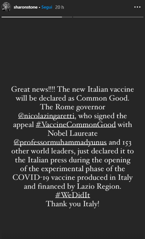 “Grande notizia!!! – ha scritto Stone sul suo post Instagram – Il nuovo vaccino italiano sarà dichiarato bene comune. Il governatore di Roma (del Lazio, ndr) Nicola Zingaretti, che ha firmato l’appello #VaccineCommonGood con il premio Nobel Muhammad Yunus e 153 altri leader mondiale, lo ha appena dichiarato alla stampa italiana in occasione del via alla fase sperimentale del covid-19 del vaccino prodotto in Italia e finanziato dalla Regione Lazio. Grazie Italia!”