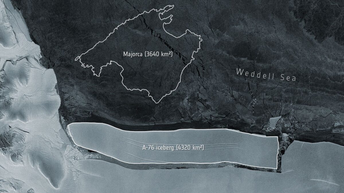 Il gigantesco blocco di ghiaccio si è distaccato dal lato occidentale della piattaforma di ghiaccio Ronne nel mare di Weddell in Antartide. L’iceberg è stato nominato A-76, è lungo circa 170 chilometri e largo 25. Queste dimensioni, come ha dichiarato l’ESA, lo rendono leggermente più grande dell’isola spagnola di Maiorca, in quanto ricopre una superfice di 4.320 chilometri quadrati.