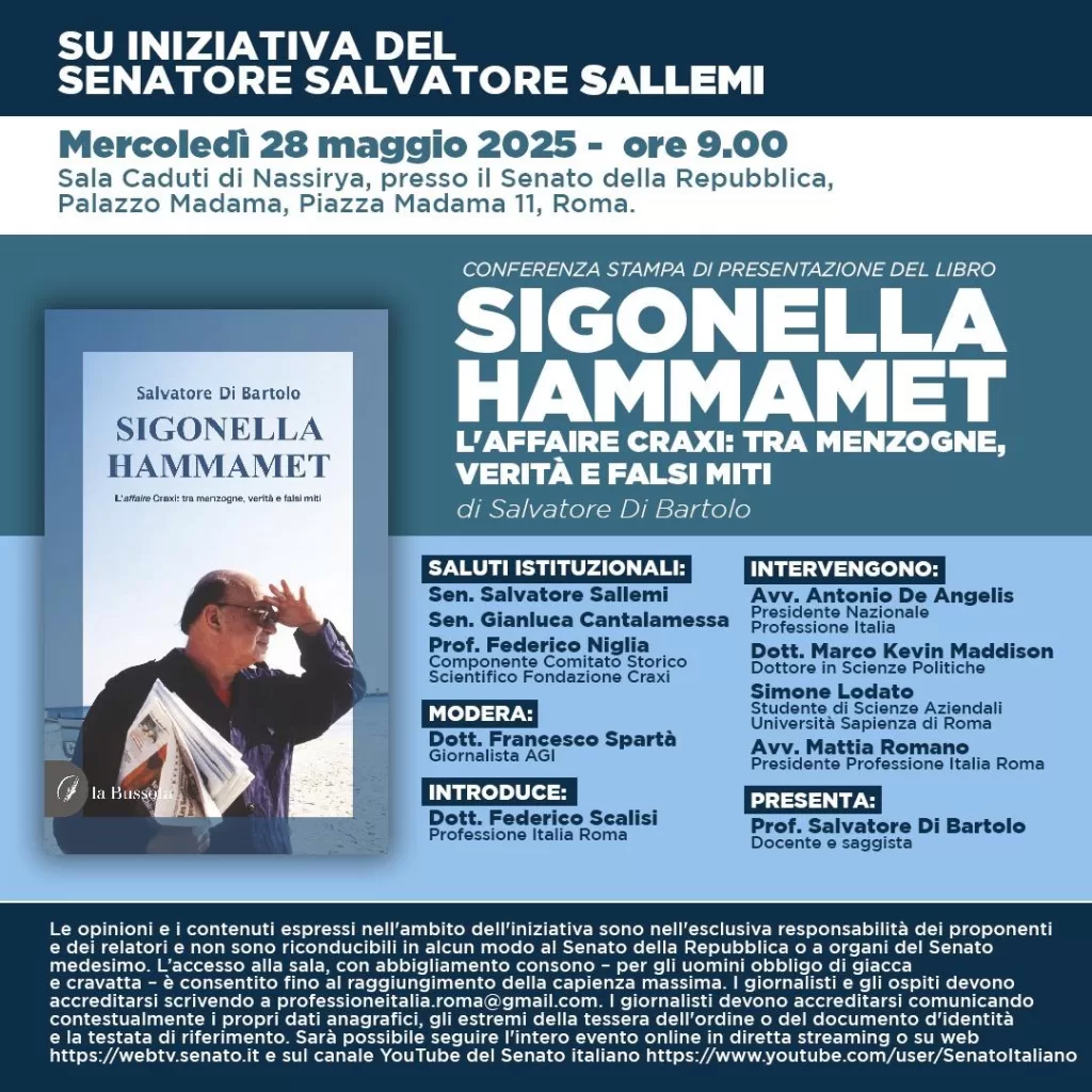 Mercoledì 28 maggio 2025 alle ore 9.00, presso la Sala Caduti di Nassirya di Palazzo Madama, si terrà la conferenza stampa di presentazione del saggio storico-politico “Sigonella-Hammamet. L’affaire Craxi: tra menzogne, verità e falsi miti”, l’ultima fatica letteraria del prof. Salvatore Di Bartolo. Il libro, pubblicato lo scorso 22 novembre 2024 con la casa editrice romana “La Bussola” dell’editore Gioacchino Onorati, ricostruisce con sguardo critico e de-ideologizzato le vicende pubbliche e private dell’ex Presidente del Consiglio e segretario del Psi Bettino Craxi a distanza di un quarto di secolo dalla sua scomparsa.
