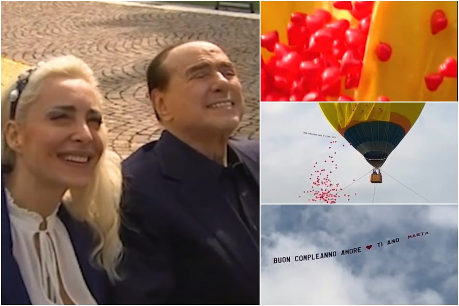 “Vedete di arrivare anche voi a questa età in forma come sono io”. Così Silvio Berlusconi ha ringraziato per gli auguri ricevuti per il suo 86esimo compleanno. Un giorno speciale per il leader di Fratelli d’Italia che ha ricevuto un altrettanto speciale sorpresa da parte della sua compagna Marta Fascina, 32 anni. Lui era seduto con lei su una panchina insieme al loro cane quando dal pratone di Arcore si è levata una mongolfiera gialla da cui sono partiti centinaia si palloncini rossi a forma di cuore.