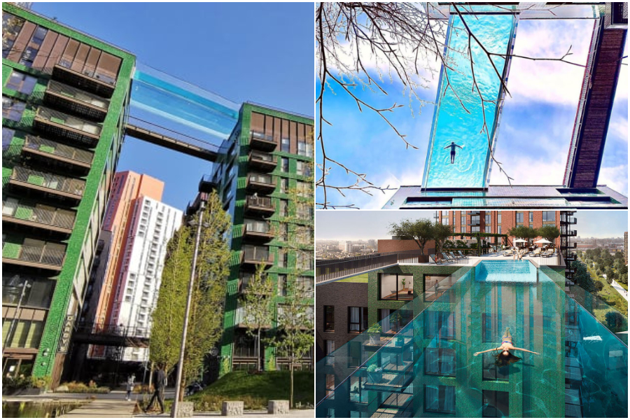 Con una profondità di tre metri e una lunghezza di 14, completamente trasparente è la più grande piscina in acrilico autoportante al mondo. Il progetto è della Embassy Gardens di EcoWorld Ballymore ed è stata prodotta in Colorado. Ovviamente prima di arrivare in Inghilterra, Sky Pool è stata sottoposta a numerosi test di resistenza. “Il sollevamento è stato un processo di precisione, poiché c’era una tolleranza di soli 30 centimetri nell’installazione della piscina nel suo telaio in acciaio”, ha affermato Ballymore.