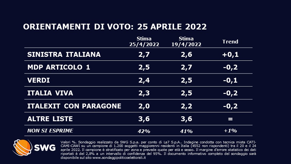Il sondaggio realizzato da SWG per conto di La7 è stato condotto con tecnica mista CATI-CAMI-CAWI su un campione di 1200 soggetti maggiorenni residenti in Italia (4552 non rispondenti) tra il 20 e il 24 aprile 2022. Il campione è stratificato per zona e prevede quote per età e sesso. Il margine d’errore statistico dei dati riportati è del 2,8% a un intervallo di confidenza del 95%.