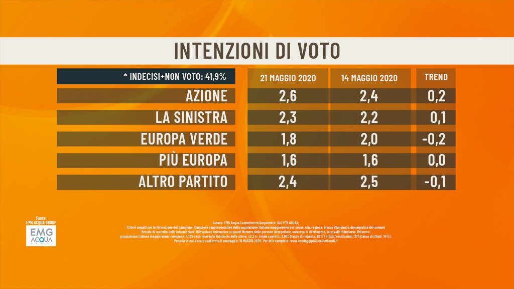 Alle spalle dei grillini c’è Fratelli d’Italia, che come il Pd guadagna lo 0,1% attestandosi così al 14,3%. Cresce anche Forza Italia, che arriva al 6,8% (+0,2%), mentre restano stabili i renziani di Italia Viva al 5 per centro. Tra i partiti minori Azione di Carlo Calenda è al 2,6% (+0,2), la Sinistra è al 2,3% (+0,1), Europa Verde all’1,8% e +Europa all’1,6%.