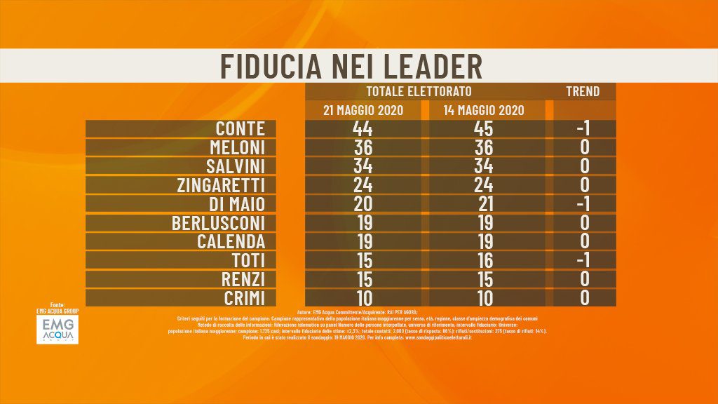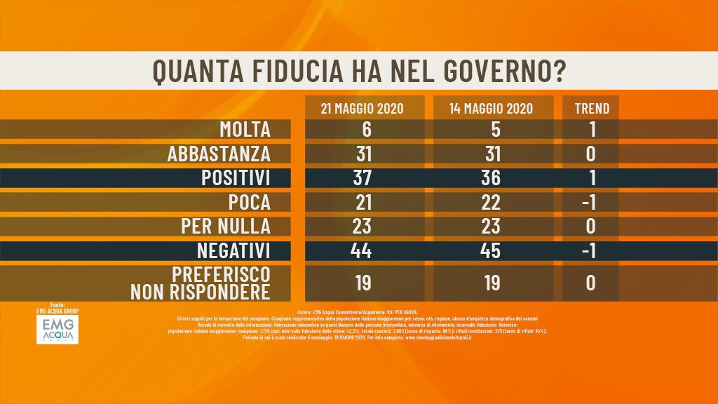 FIDUCIA IN GOVERNO E LEADER – In crescita di un punto percentuale rispetto alla scorsa settimana è la fiducia nel governo Conte, salita complessivamente al 37%, mentre sono in calo i giudici negativi (44%). Per quanto riguarda i vari leader politici, scendono Conte e Di Maio, mentre sono stabili i sovranisti Meloni e Salvini.
